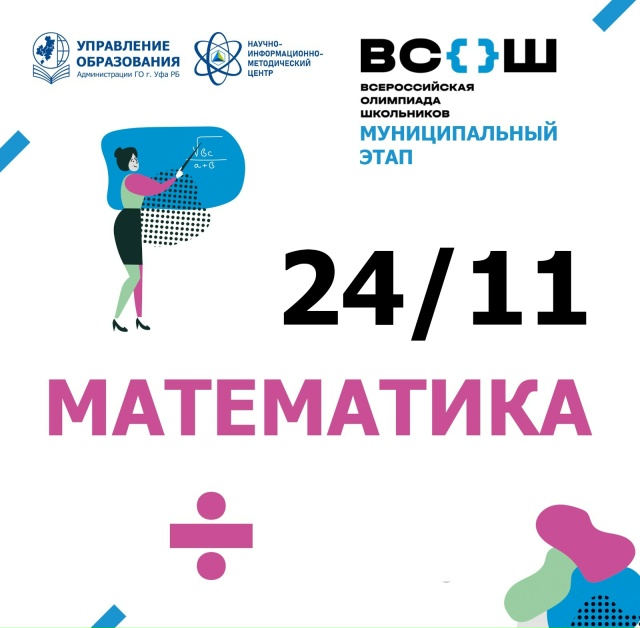 Муниципальный этап олимпиады по математике проходит в один тур. Пункты проведения: Лицей №21, Центр образования №35, Лицей № 68, Школа № 71, Школа № 85, Школа № 101, Школа №103 с углубленным изучением иностранного языка, Школа №110, Школа №113 им. И.И. Рыбалко, Школа №126, Школа № 127, Башкирский лицей № 136.